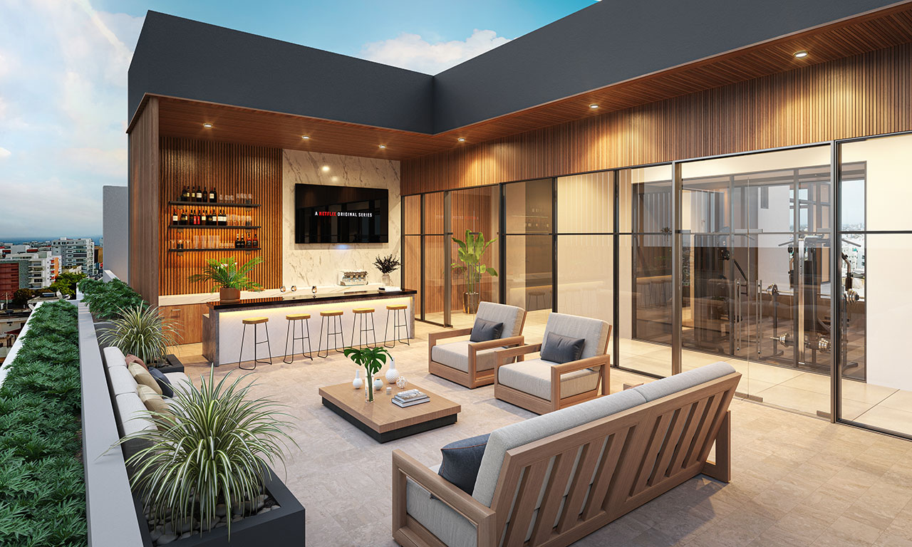 La Ubicación de sus áreas sociales en el último nivel; esta pensada para el disfrute y comodidad de los residentes además de brindandar espectaculares vistas de la ciudad.