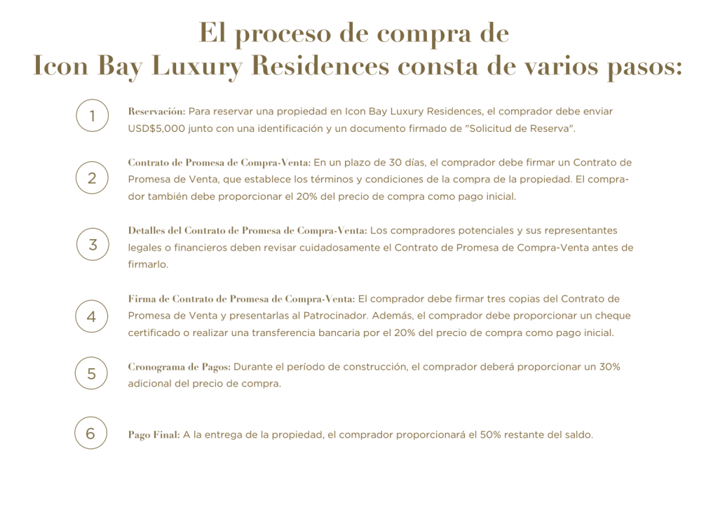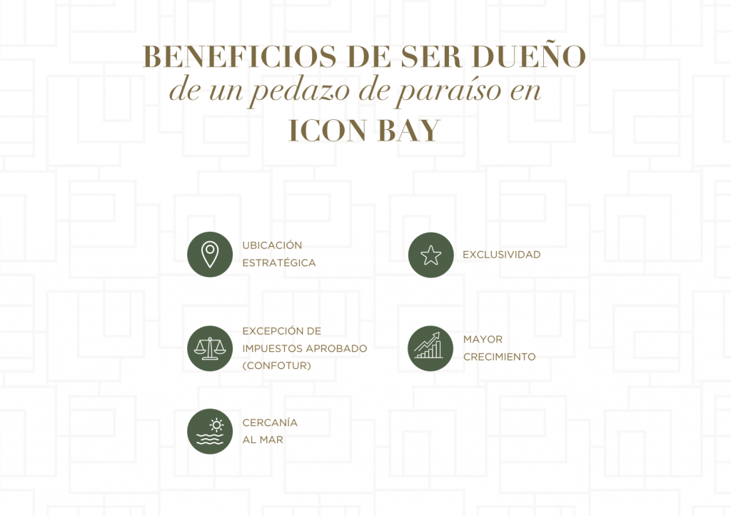 Icon Bay Luxury Residences incluye un estacionamiento soterrado y consta de seis pisos de altura, con un área central dedicada a una piscina semiolímpica, bar, y una zona de recepción. Además, cuenta con comodidades en la azotea, que incluyen una piscina infinita y un bar. Su diseño en forma de 'U' no solo optimiza las vistas panorámicas desde cada apartamento, sino que también maximiza la utilidad del terreno.